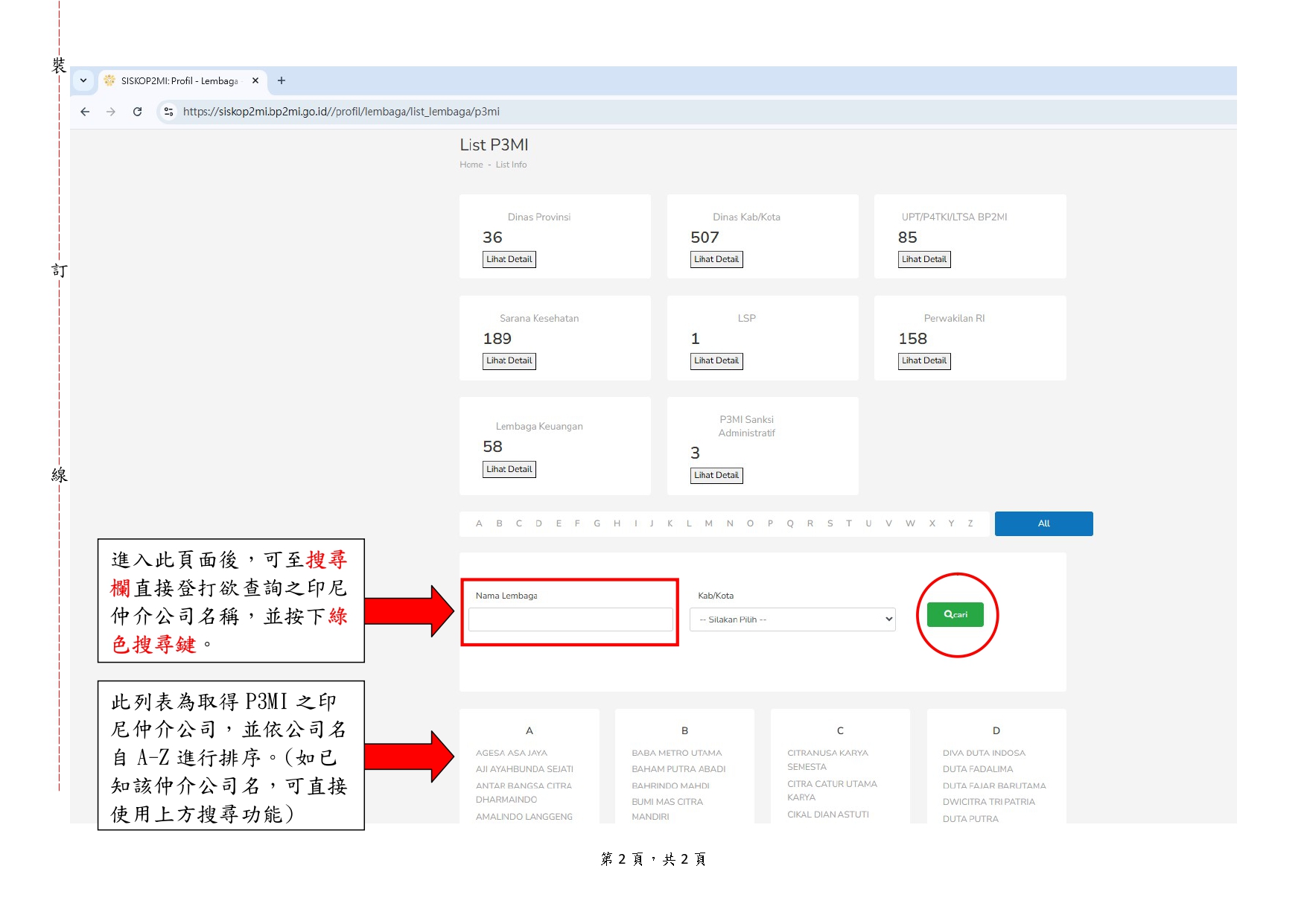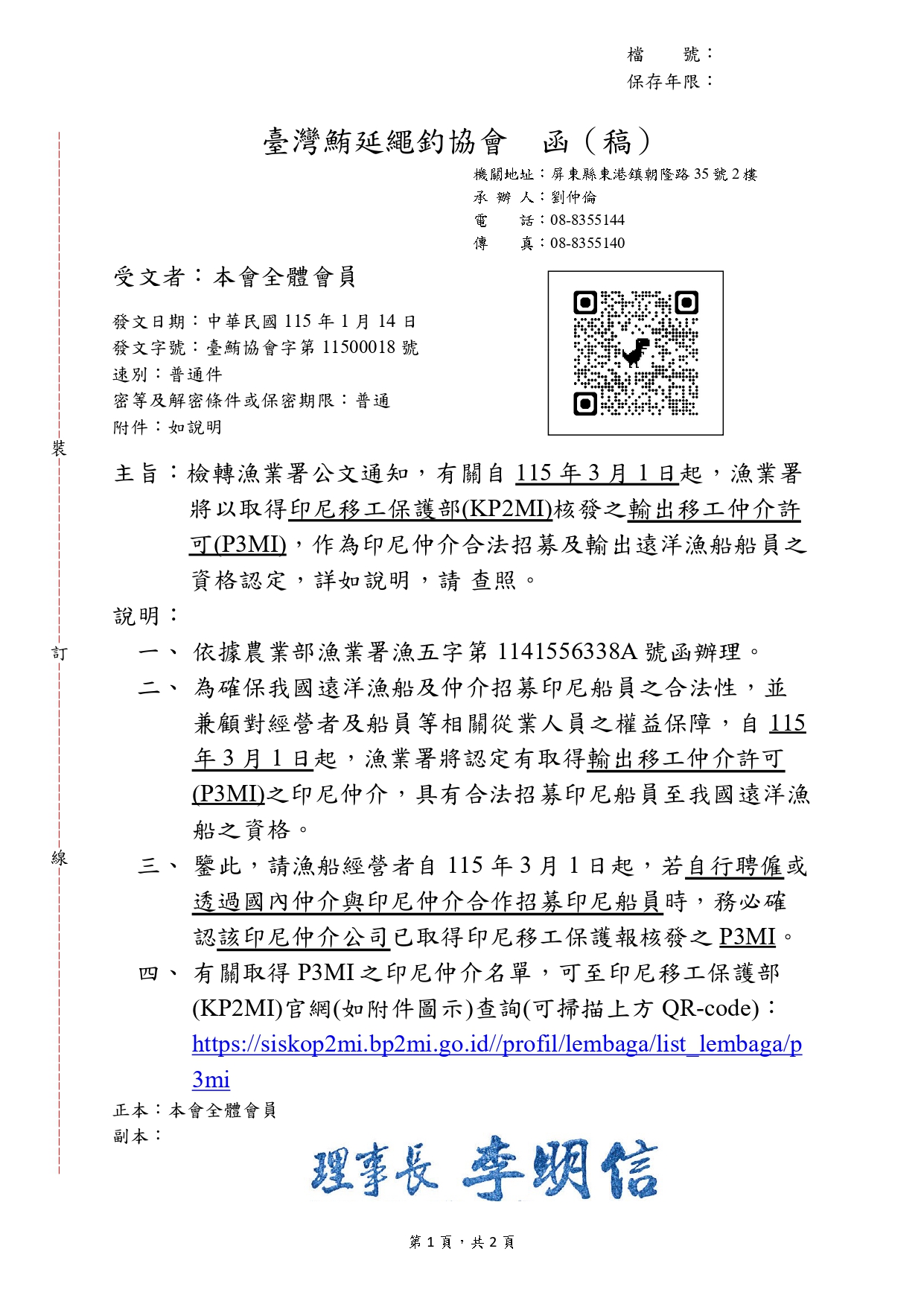 有關自115年3月1日起,漁業署將以取得印尼移工保護部(KP2MI)核發之輸出移工仲介許可(P3MI),作為印尼仲介合法招募及輸出遠洋漁船船員之資格認定,詳細內容請參閱公文。 ※已取得P3MI之印尼仲介名單,可至印尼移工保護部(KP2MI)官網(如附件圖示)查詢:https://siskop2mi.bp2mi.go.id//profil/lembaga/list_lembaga/p3mi