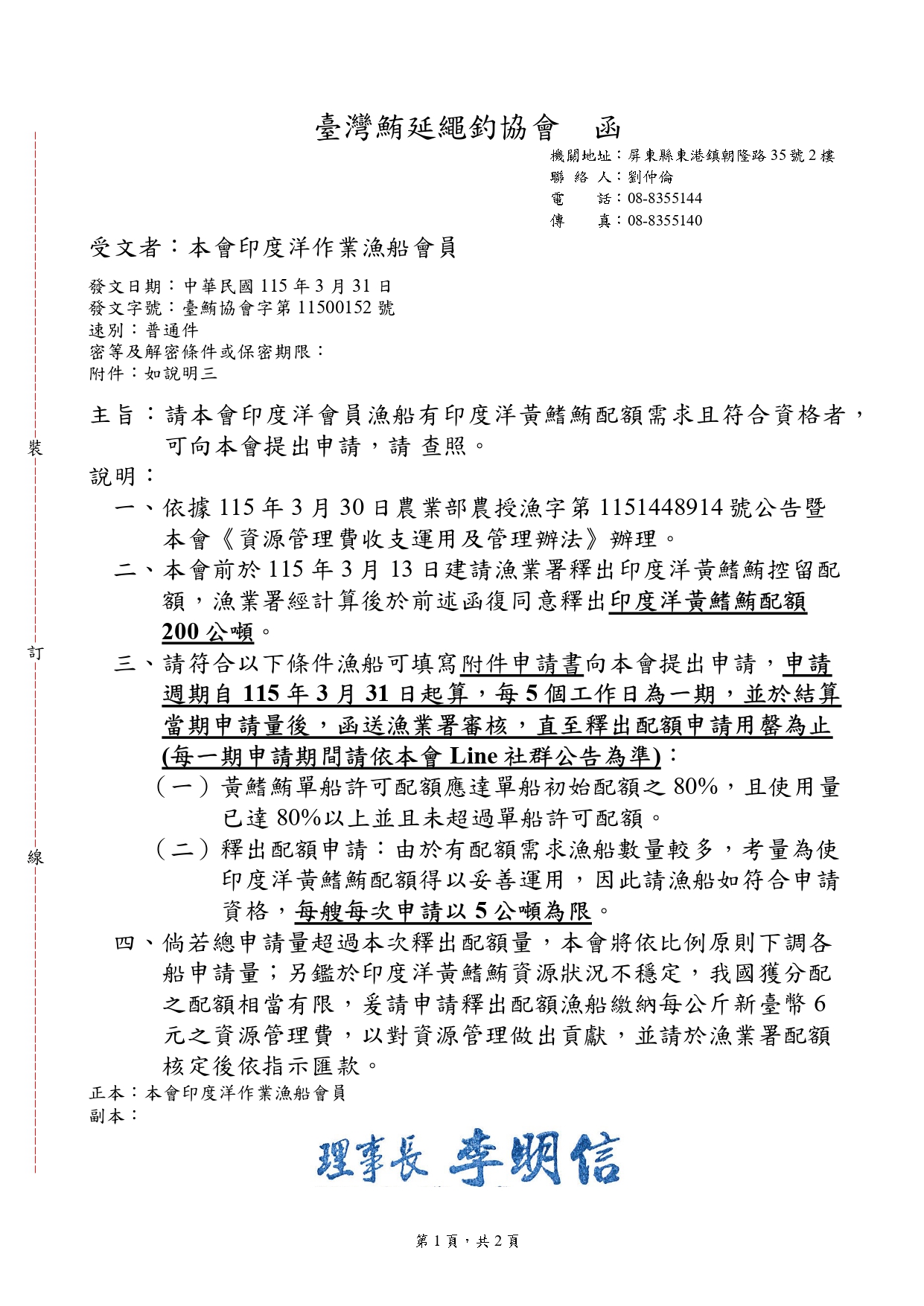 本會前於115年3月13日建請漁業署釋出印度洋黃鰭鮪控留配額,漁業署經計算後函復同意釋出印度洋黃鰭鮪配額200公噸。 申請週期自115年3月31日起算,每5個工作日為一期,並於結算當期申請量後,函送漁業署審核,直至釋出配額申請用罄為止。如符合申請條件並有配額需求者,可填寫配額申請書向本會提出申請,詳細資訊請參閱附件公文。 ★申請書請點選下載:115年印度洋黃鰭鮪配額申請書