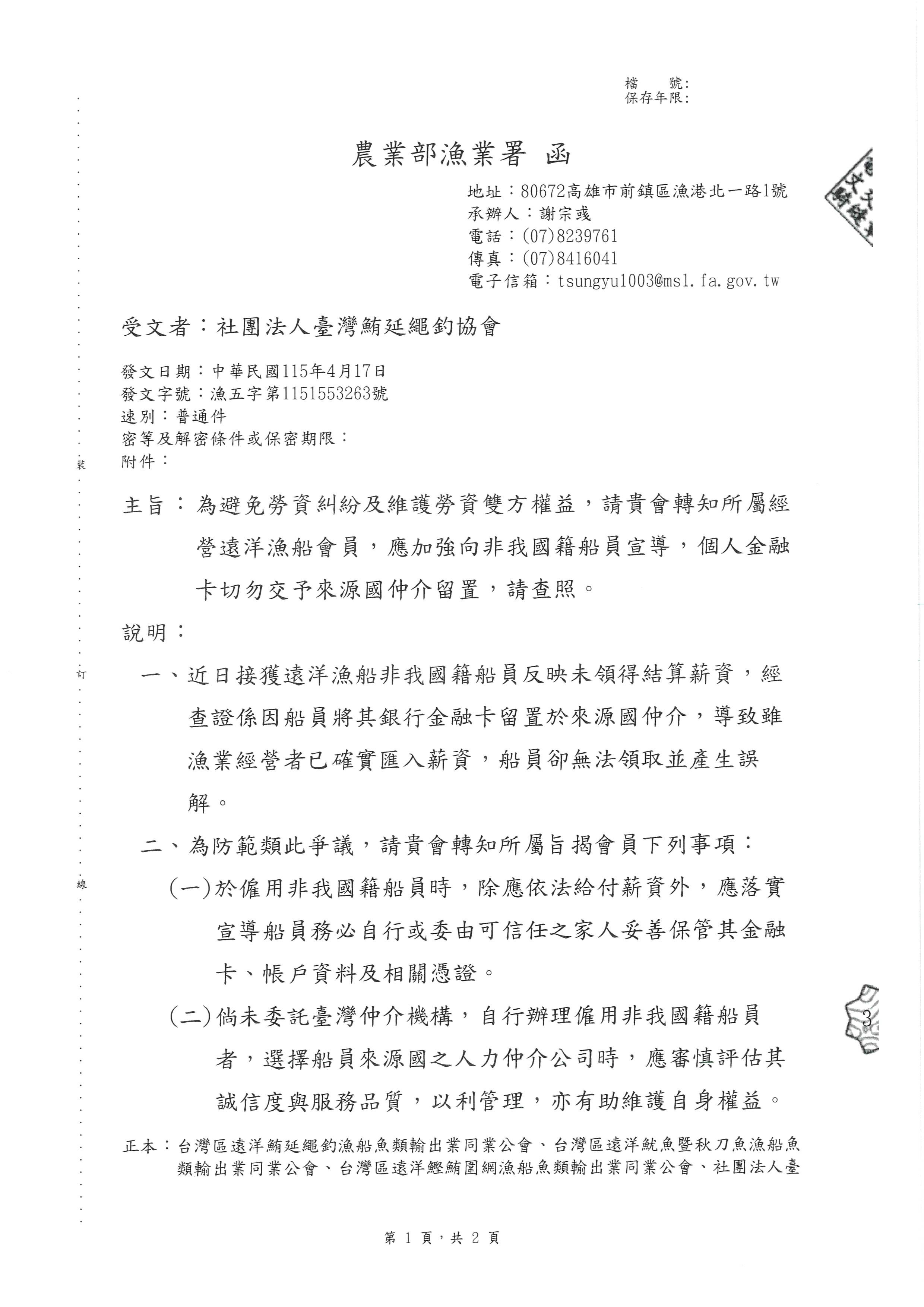 遠洋漁船非我國籍船員薪資領取爭議防範宣導 由於近期有非我國籍船員反映未領得結算薪資,經查係因船員將個人金融卡交由來源國仲介留置,導致船主雖已匯款,船員卻無法提領而產生爭議。 為避免產生爭議,請會員向船員宣導船員的金融卡及帳戶資料應由本人或委託可信任之家人保管,切勿交予仲介留置。另外,請自行聘僱非我國籍船員之會員審慎選擇來源國仲介。