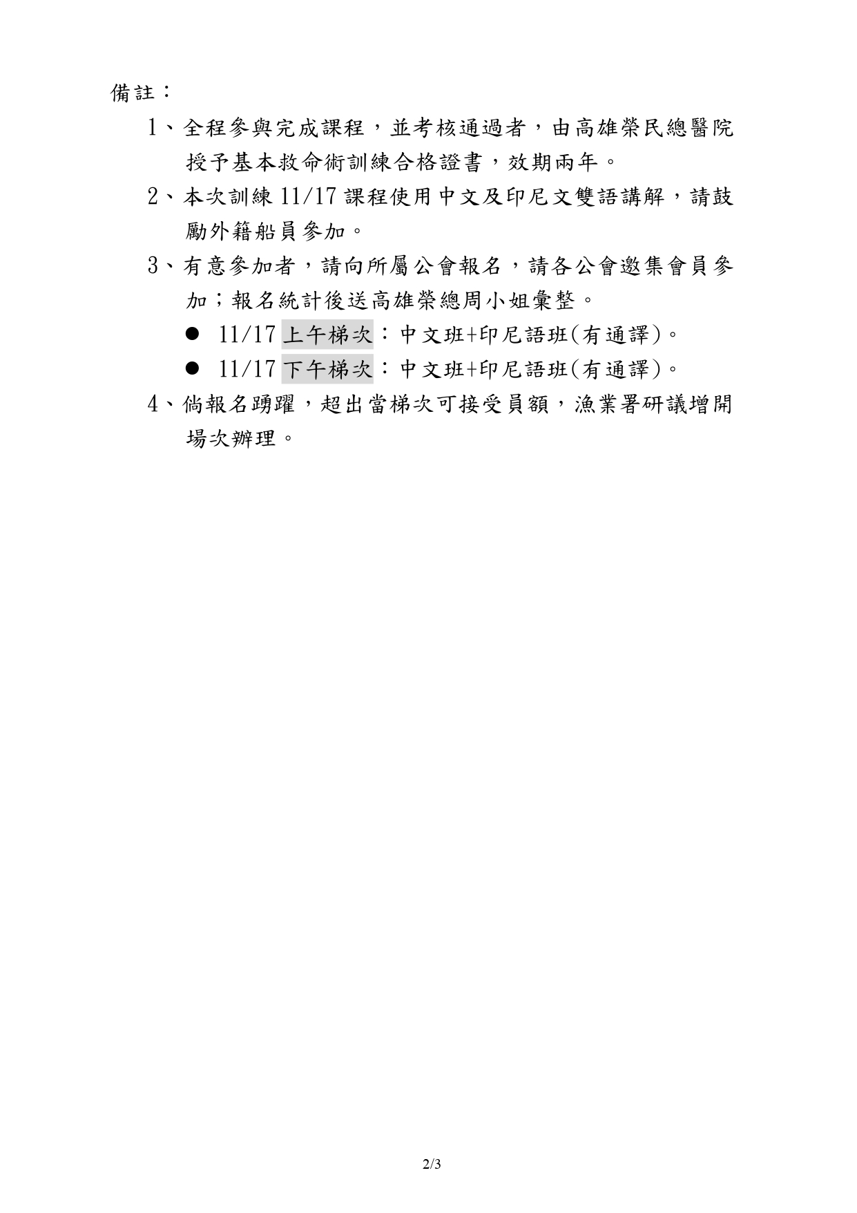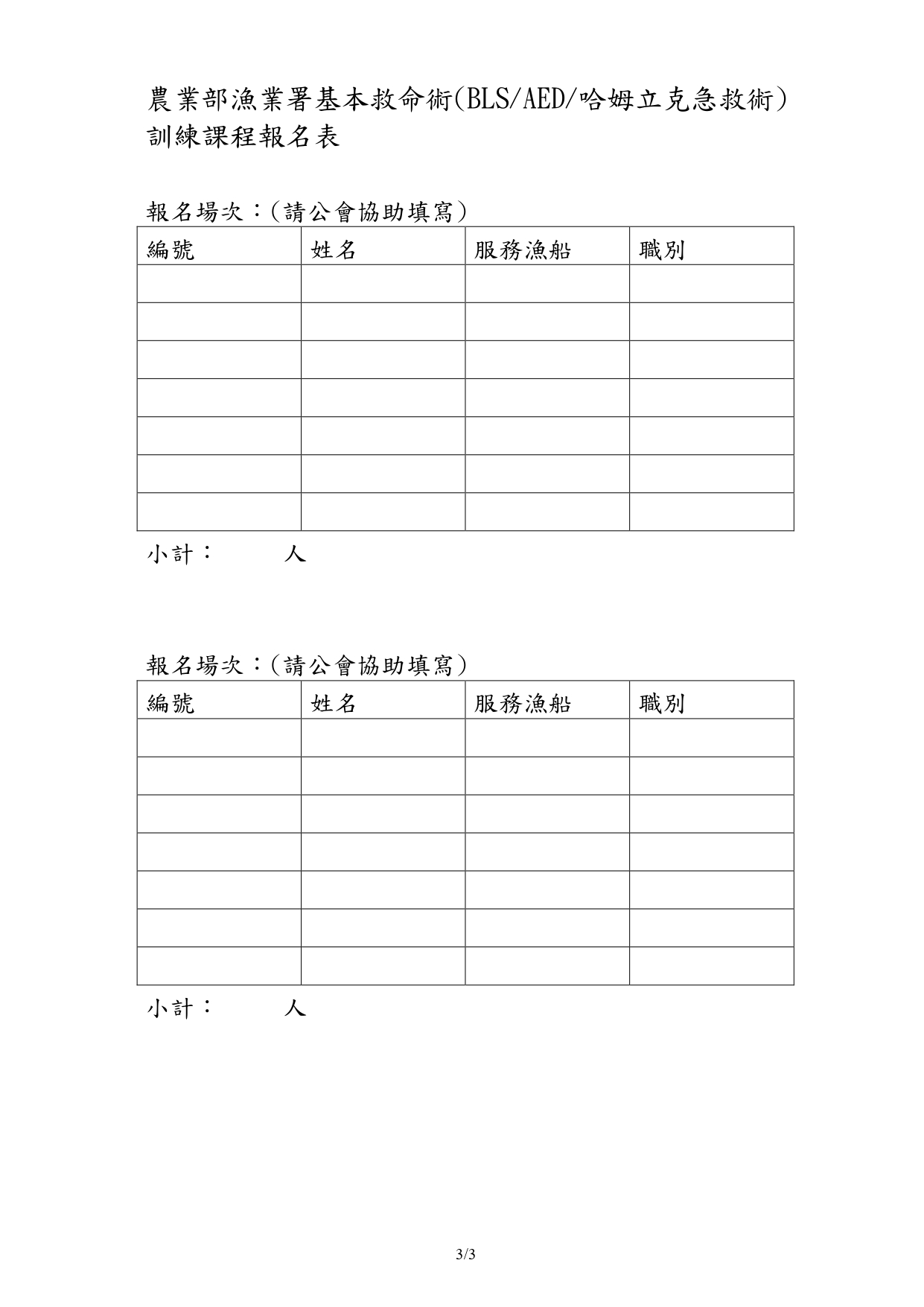 基本救命術訓練課程 農業部漁業署與高雄榮總於114年11月17日(一)在協會1樓會議室舉辦 「基本救命術訓練課程(BLS / AED / 哈姆立克急救術)」! 詳細場次時間、課程內容請參閱附件,有意願參加者,請於11月7日前向協會報名,謝謝! https://org.vghks.gov.tw/thc/News_Content.aspx?n=0A9203C2845C1437&sms=B1AD9BA0C62B4599&s=89F0689F0CD66AD0