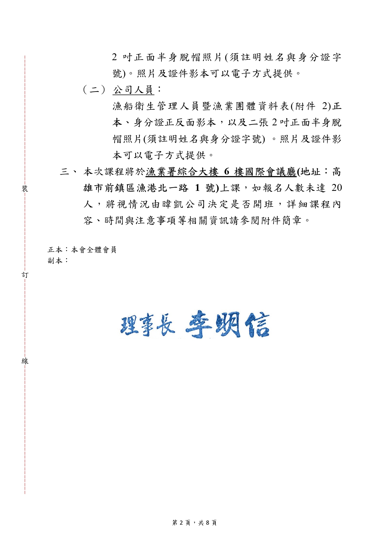 114年11月份甲類外銷登錄遠洋漁船船長及衛生管理人員衛生教育訓練 本會會員漁船欲參加114年11月份「甲類外銷登錄遠洋漁船船長及衛生管理人員衛生教育訓練」課程,請於10月31日(星期五)中午12:00前,完成線上報名並檢附相關文件繳至本會。 ※「甲類外銷登錄遠洋漁船船長及衛生管理人員衛生教育訓練」課程簡章下載:請點此