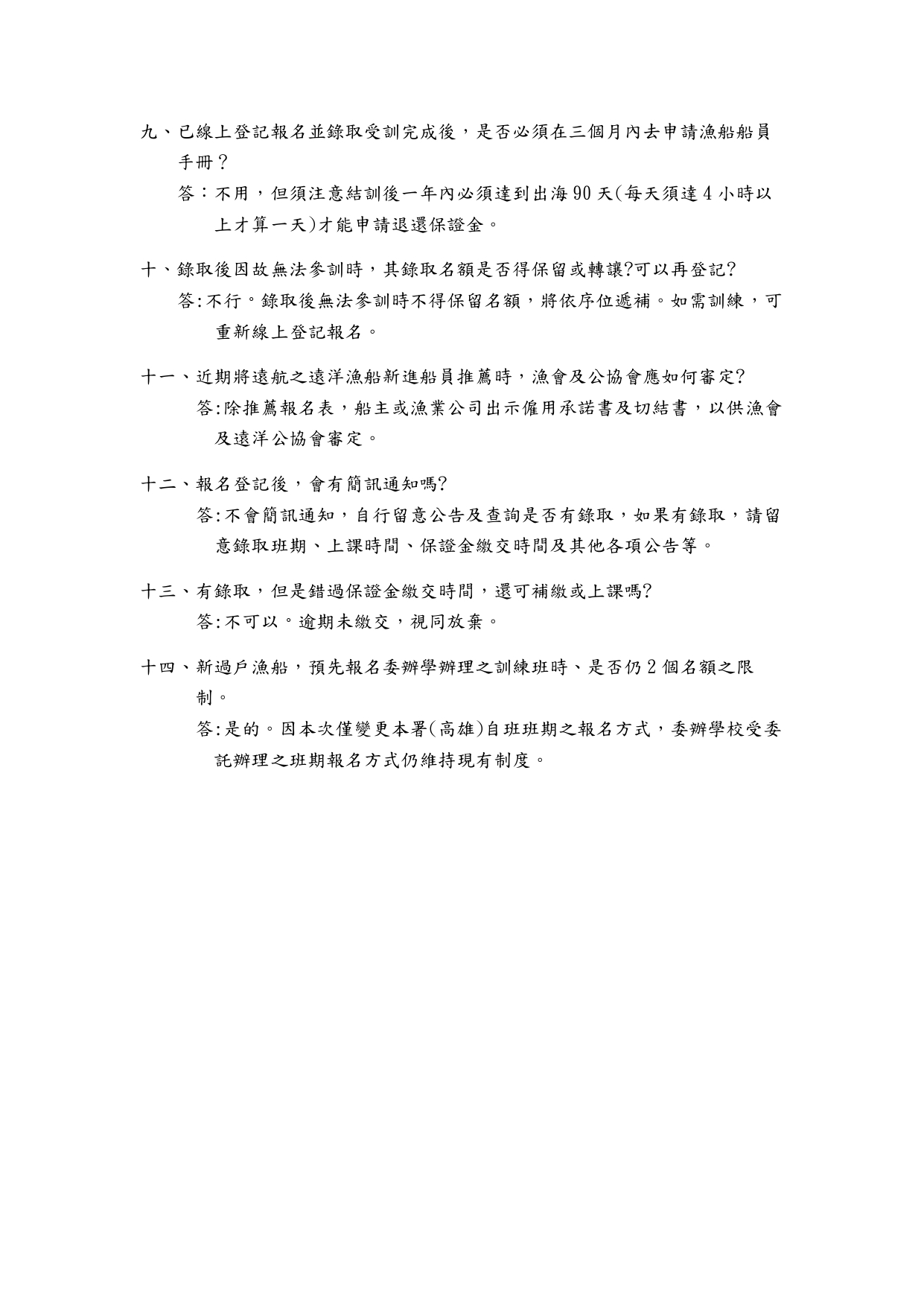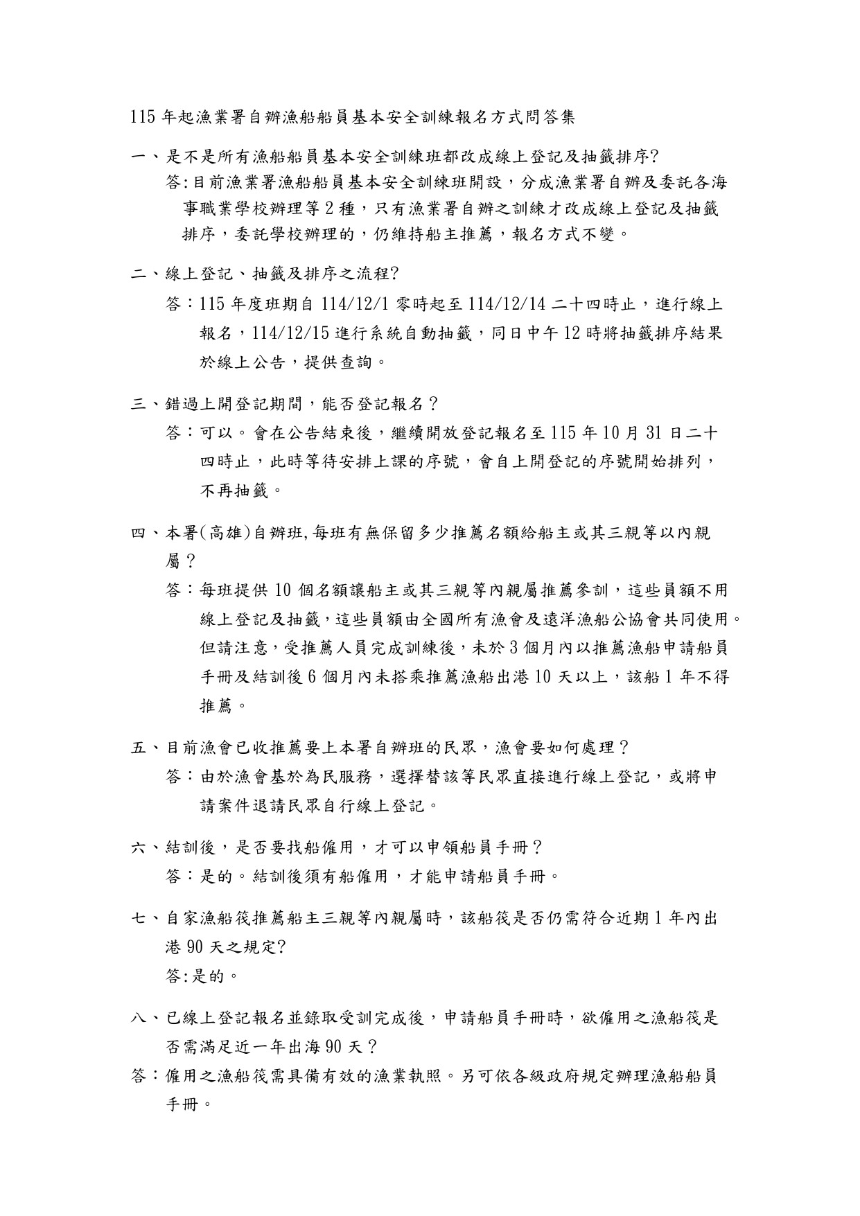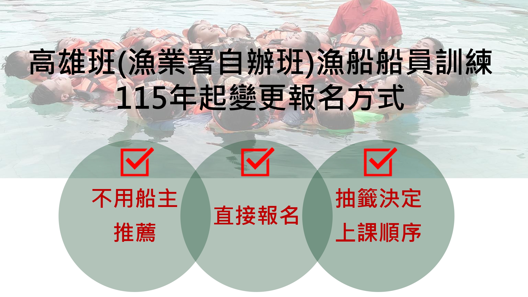 基本安全訓練班報名程序修正 基本安全訓練班報名程序修正,明年起將改為網路報名登記及抽籤方式進行,不須船主推薦可直接報名,再透過抽籤決定上課順序及日期,欲上2026年班次者,請於2025年12月1日至12月14日於網路報名,15日將公告抽籤結果,詳細資訊請參考附件公文及圖卡說明。 ※報名網址:https://dsfrdc.fa.gov.tw/fishtype/Default.aspx
